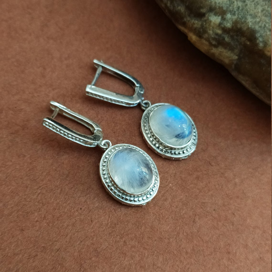 925 Sterling Zilveren Oorbellen met Blue-Fire Regenboogmaansteen – Vintage Luxe – Handgemaakt