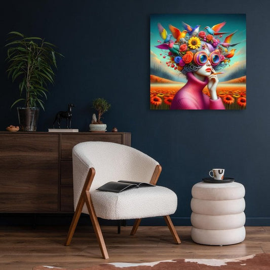 Prachtige Acrylglas Schilderij “Woman with Unusual Glasses I” – Vrouw met Bloemen & Vogels