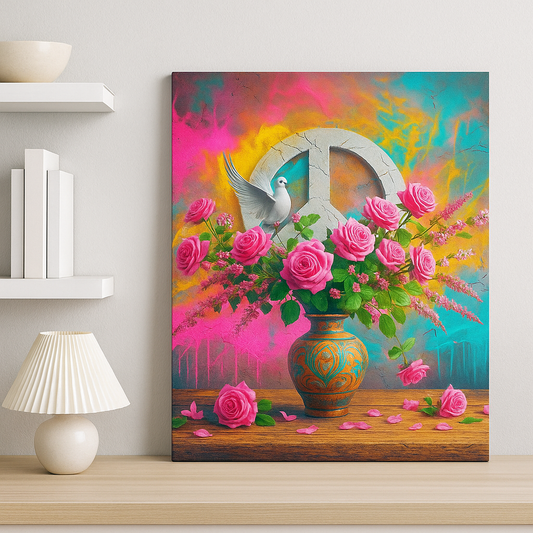 Prachtige Acrylglas Schilderij “Flowers, Peace & Color” – Bloemen, Vredesteken en Duif op Modern Kunstwerk