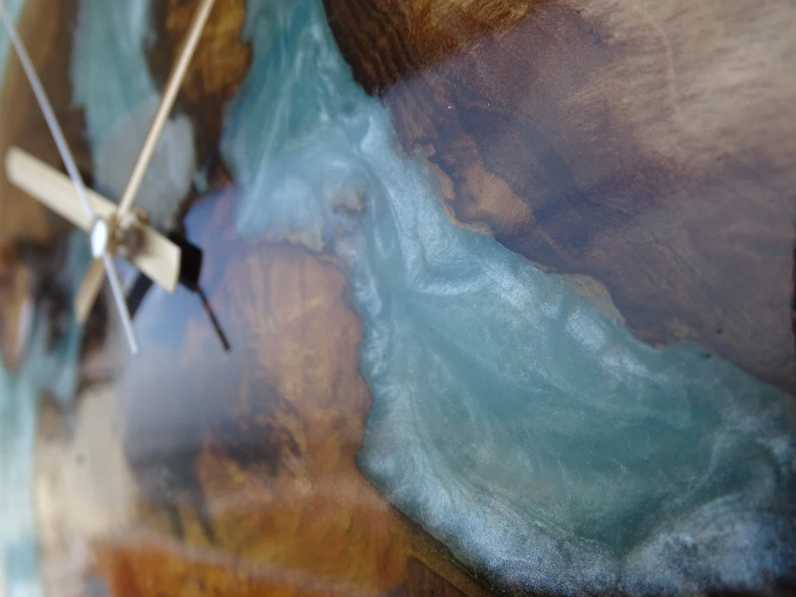 Lichtblauwe Epoxy Houten Wandklok met Bruine Accenten