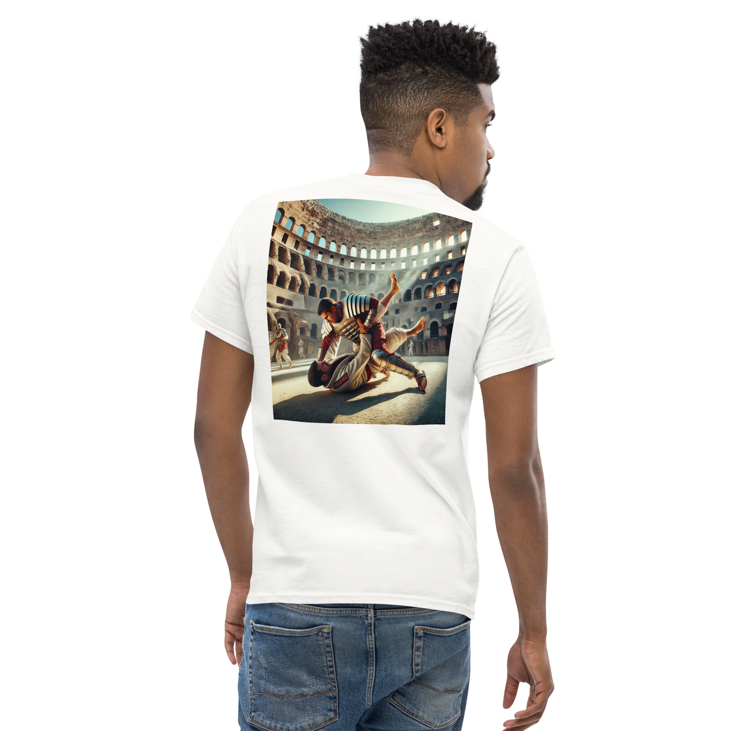 The striking print on this t-shirt shows two powerful men practicing Brazilian Jiu-Jitsu in the iconic Colosseum. This unique combination of martial arts and historical scenery exudes strength, discipline and a passion for BJJ. Perfect for the martial arts enthusiast who wants to show their pride both on and off the mat.