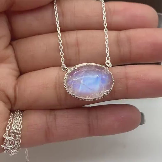 Blue Fire Maansteen Ketting – 925 Sterling Zilver • Ovale Vintage Hanger
