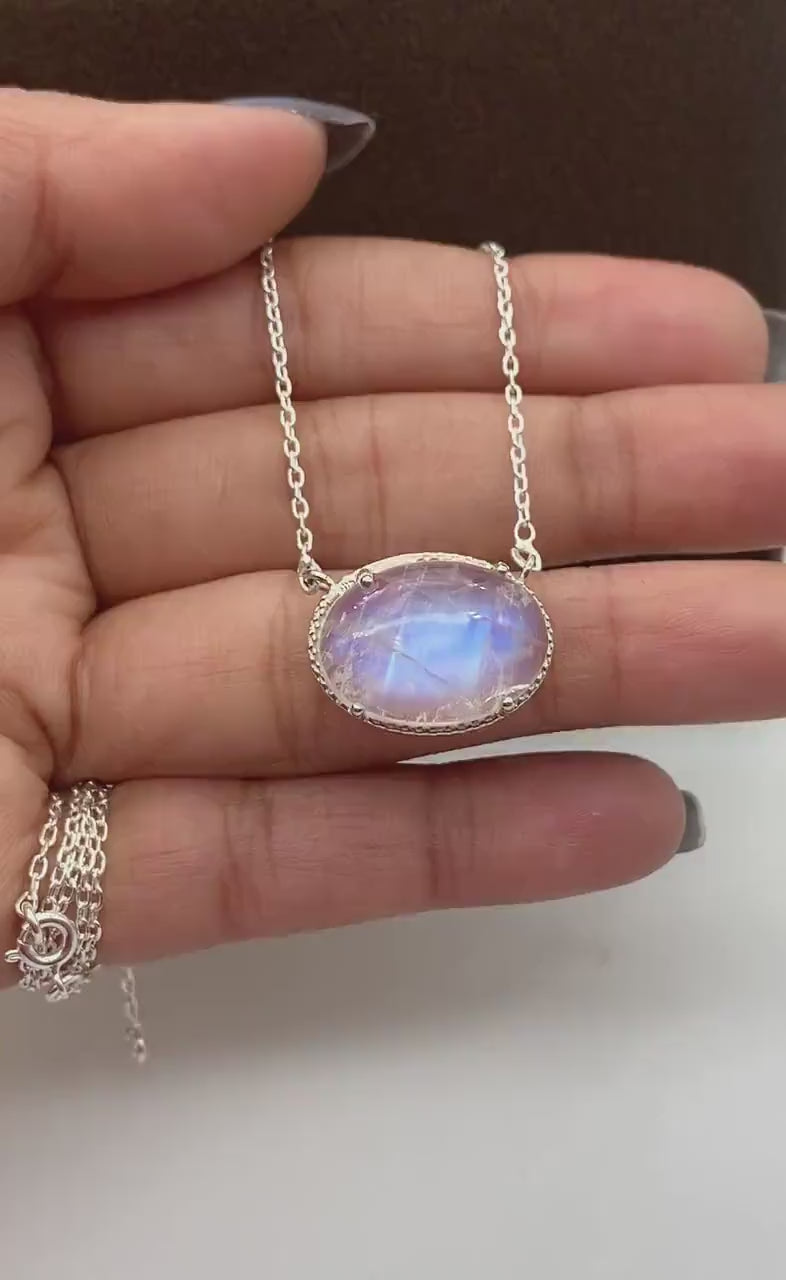 Een elegante 925 sterling zilveren ketting met een prachtige Blue Fire Maansteen die schittert met een blauw-witte gloed. Handgemaakt, stijlvol en perfect voor elke gelegenheid.